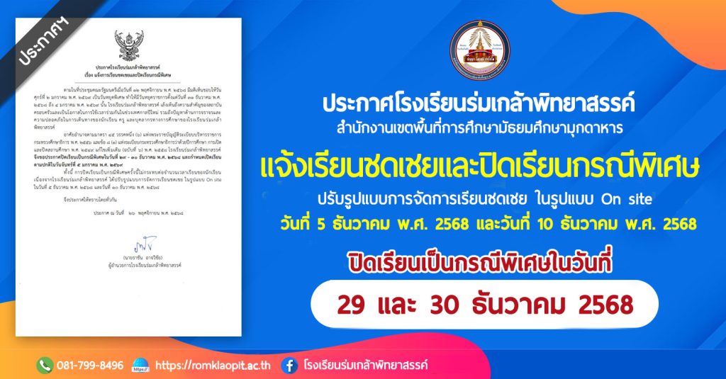 โรงเรียนร่มเกล้าพิทยาสรรค์ ประกาศปิดเรียนเป็นกรณีพิเศษในวันที่ 29 – 30 ธันวาคม พ.ศ. 2568และกำหนดเปิดเรียนตามปกติในวันจันทร์ที่ 5 มกราคม พ.ศ. 2569